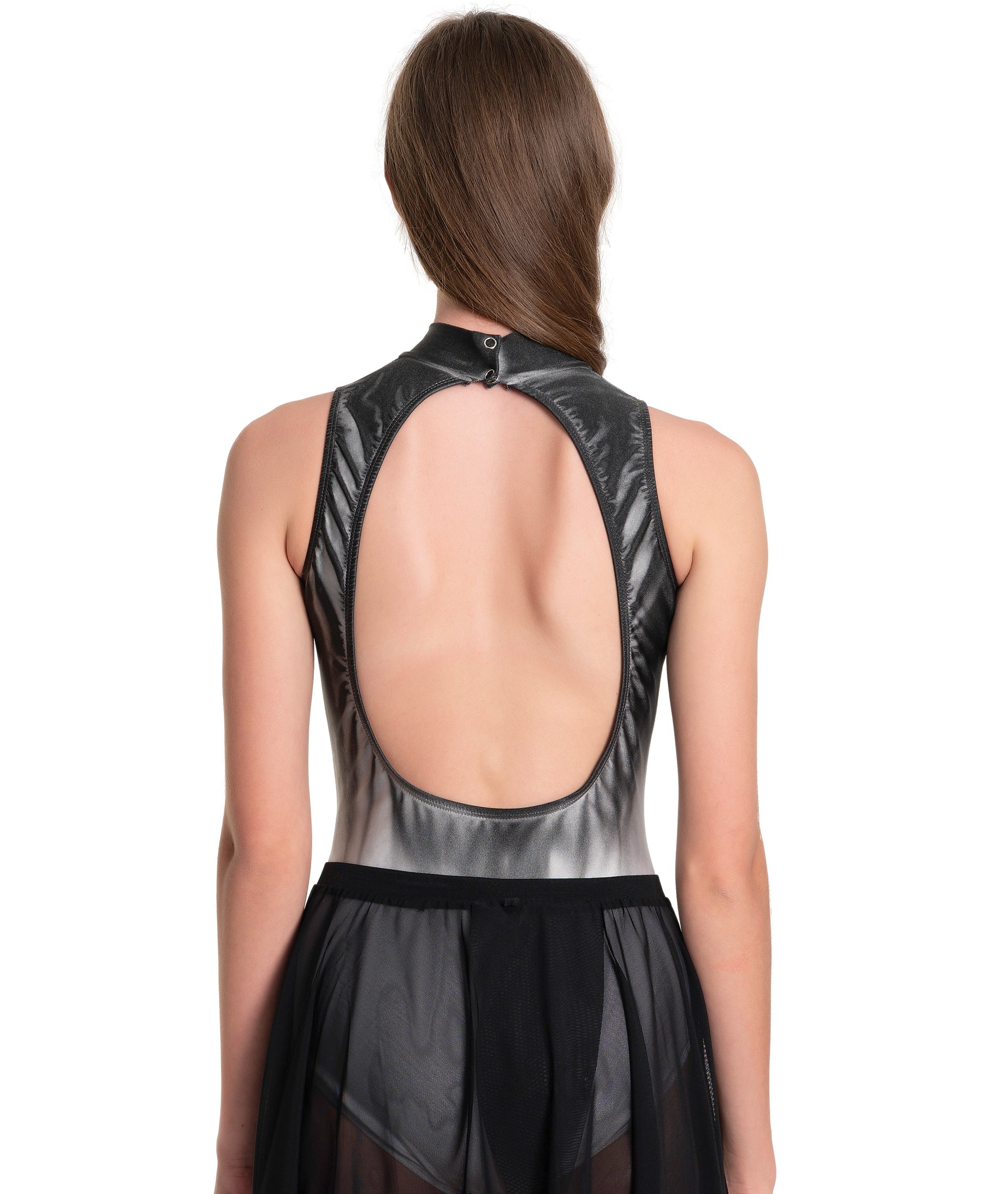 This chic and contemporary T-neck leotard features a large open keyhole back with a striking Black fade on a White base, designed to offer a modern and bold look for any performance.